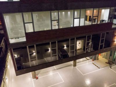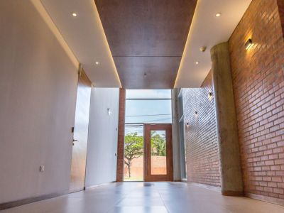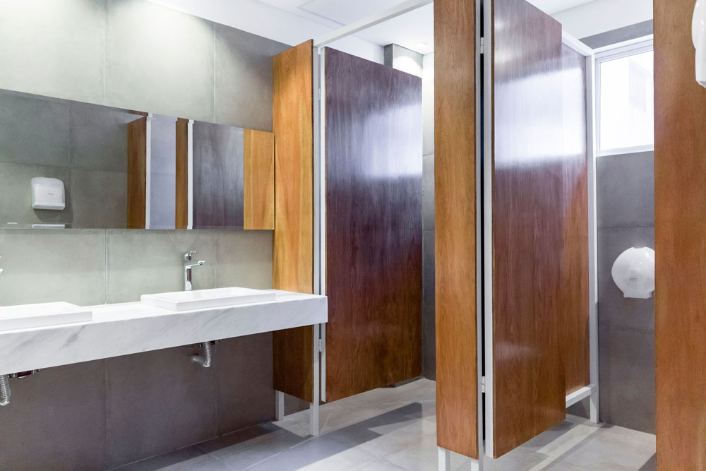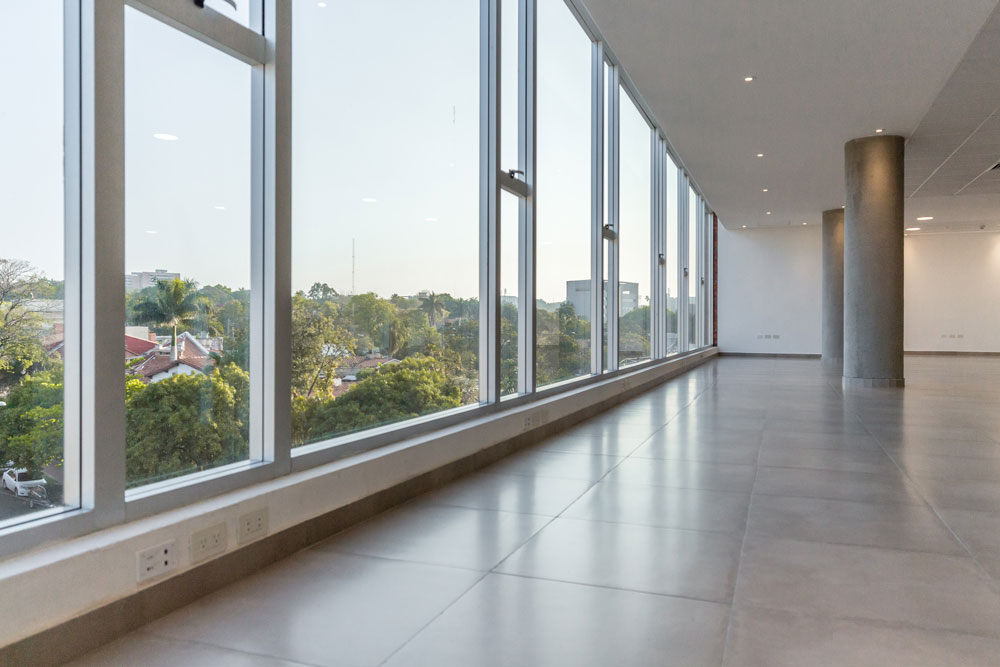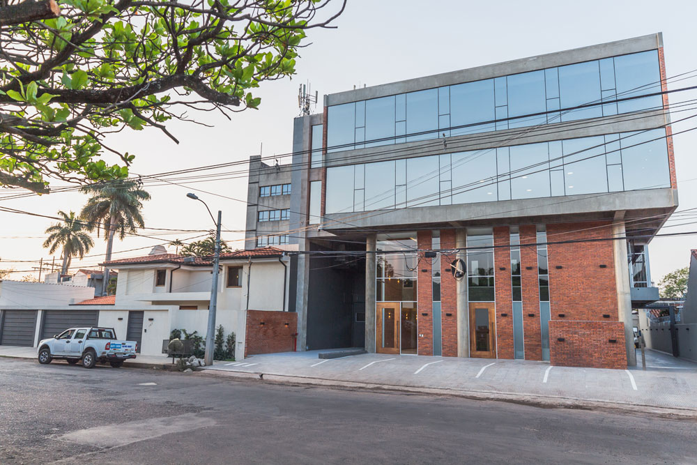 Desarrollo ejecutivo del edificio corporativo El Dorado, Fabricación de puertas pivotantes y batientes enchapadas en paraíso, Barandas metálicas, Mamparas para baños en eucalipto, Revestidos ascensores y lobby en eucalipto, Mueble de recepción en melamina blanca y enchapado en paraíso, Puertas principales de lobby pivotantes en madera maciza de Timbó con vidrio templado y tiradores metálicos.